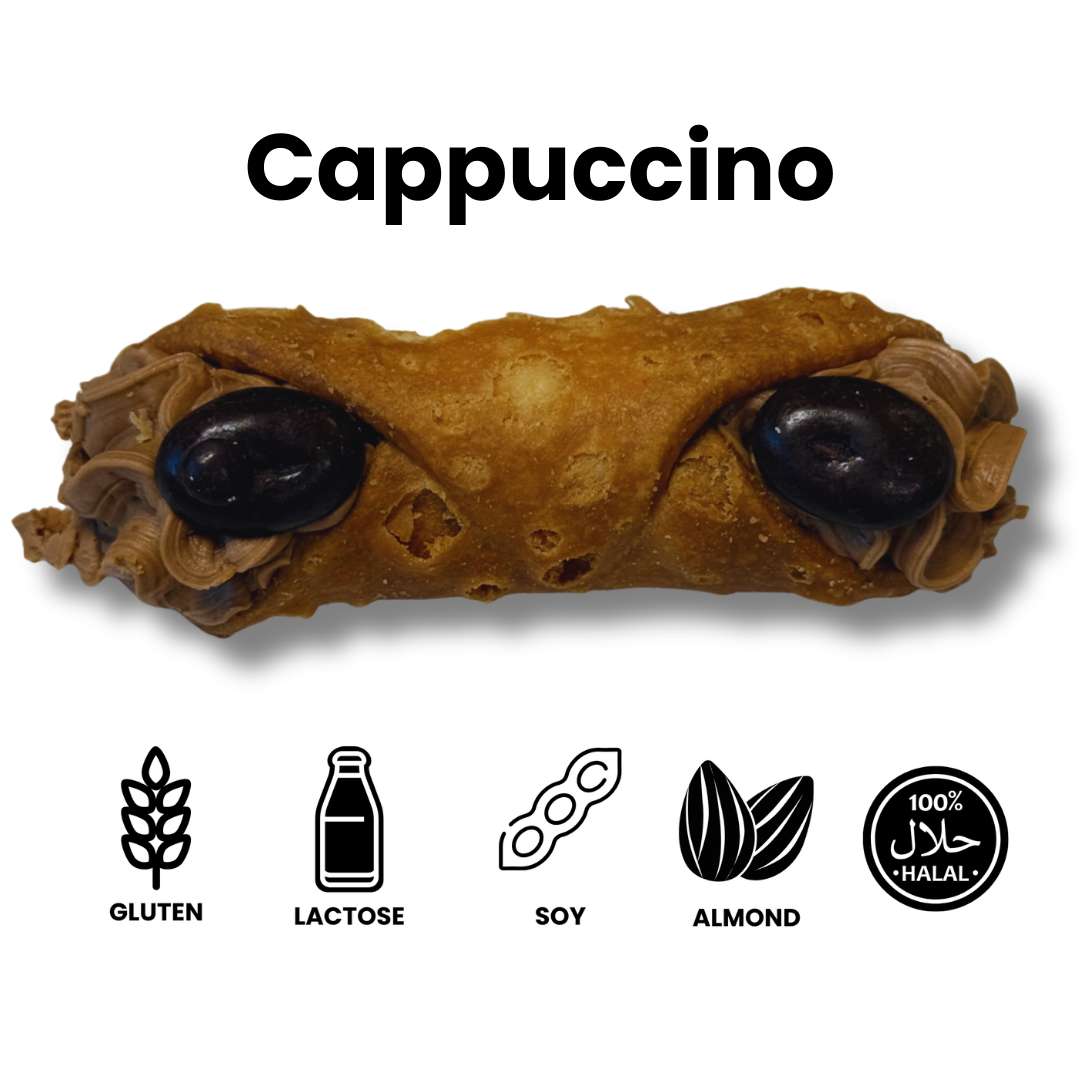 Deze cannolo is gevuld met een romige cappuccino-crème en knapperige praliné crisp voor de perfecte balans tussen zacht en crunchy. De cacao-topping zorgt voor een verfijnde finishing touch en een volle, rijke koffiesmaak.