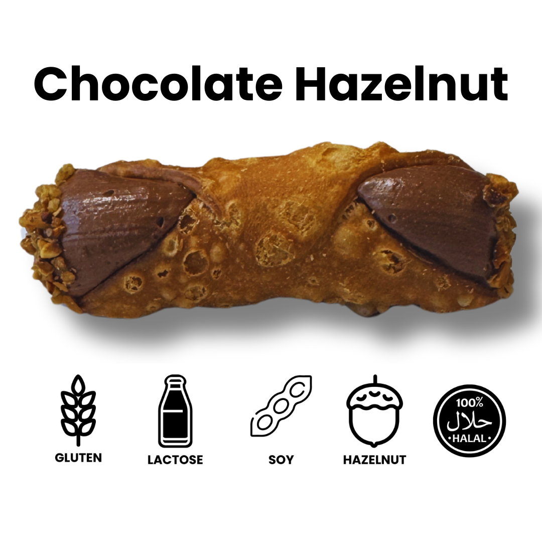 Onze chocolade-hazelnoot cannolo combineert romige chocoladecrème met licht geroosterde hazelnoten voor een volle, fluweelzachte smaak. Afgewerkt met gekarameliseerde hazelnootjes voor een onweerstaanbare crunch bij elke hap.