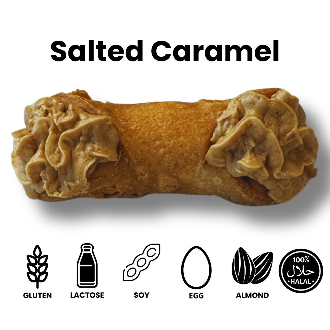 Onze salted caramel cannolo is gevuld met een zijdezachte karamelcrème, perfect in balans gebracht met een subtiel vleugje fleur de sel – een verfijnde traktatie voor echte liefhebbers.