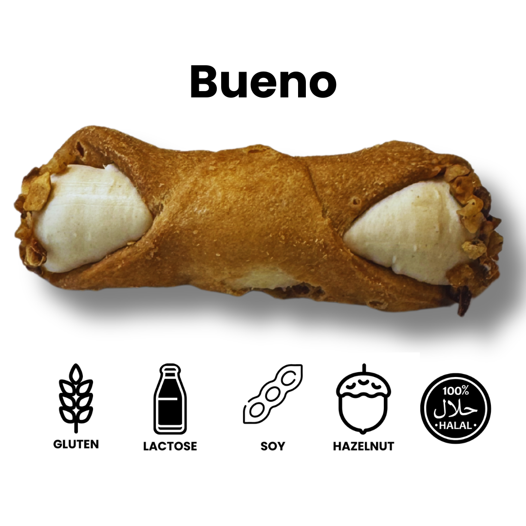 Deze cannolo is gevuld met een romige hazelnootcrème en afgewerkt met krokant geroosterde hazelnootjes voor een volle, nootachtige smaakbeleving bij elke hap.