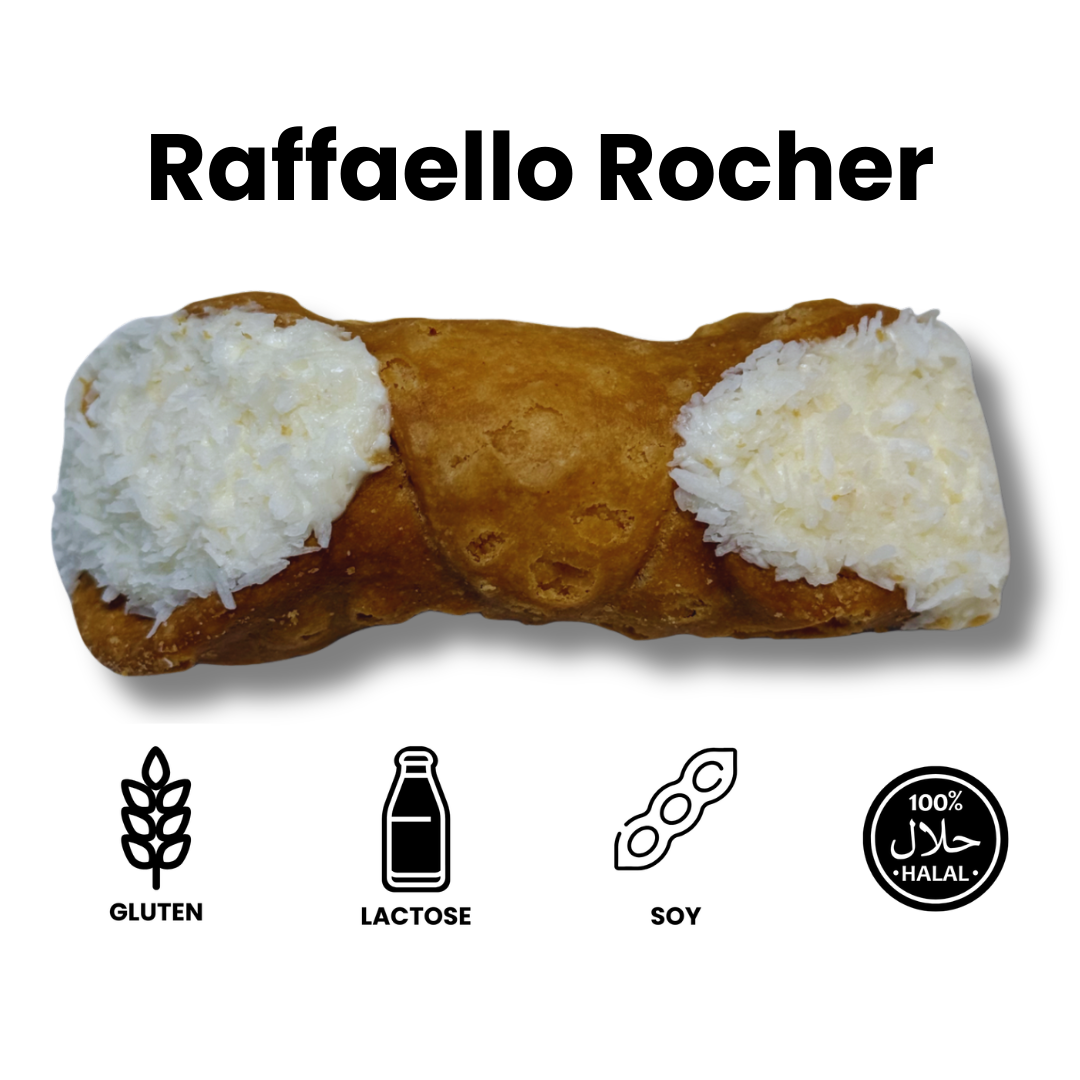 Laat je verleiden door onze Raffaello Rocher cannolo. Romige witte chocoladecrème, zachte kokos en een hint amandel smelten samen tot een elegante, luxe smaaksensatie in elke hap.